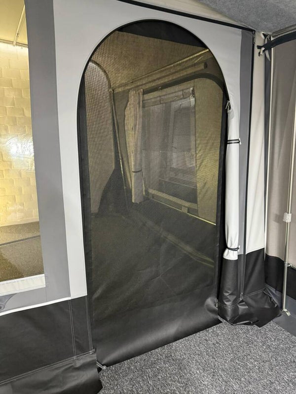 Stevige ventilatiedeur van zwart versterkt gaas om de voortent goed te kunnen afsluiten tegen ongedierte, terwijl de voortent voldoende geventileerd en frisser blijft.